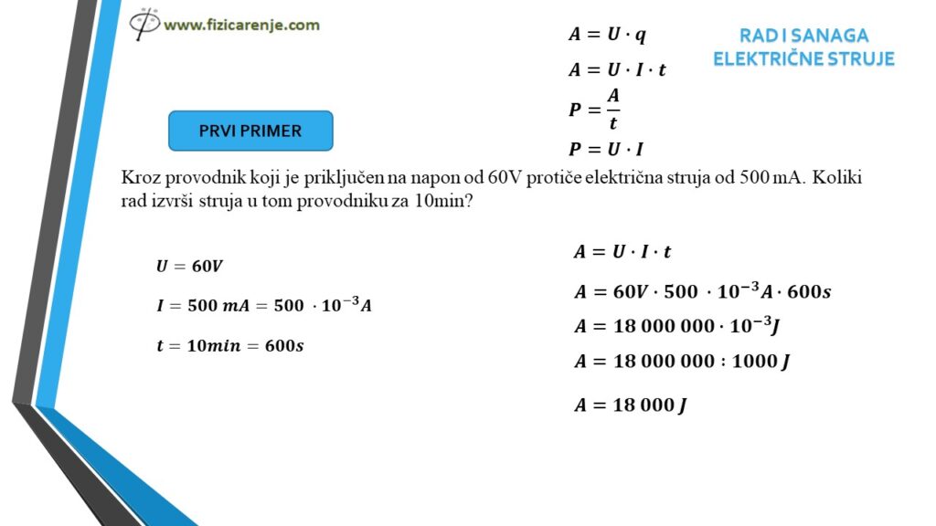 Kroz provodnik koji je priključen na napon od 60 V protiče električna struja od 500 mA. Koliki rad izvrši struja u tom provodniku za 10 min?