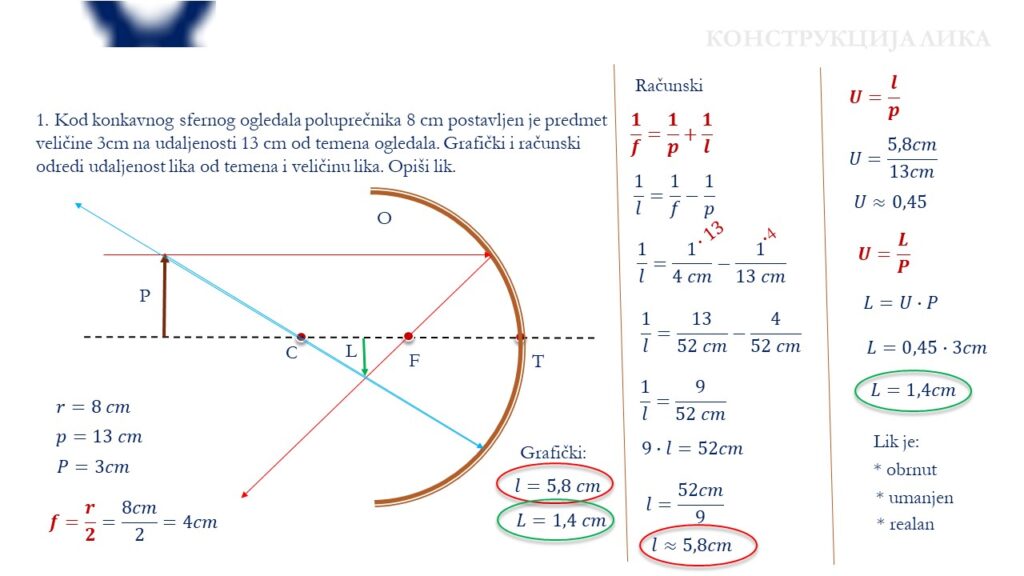 1. Kod konkavnog sfernog ogledala poluprečnika 8 cm postavljen je predmet veličine 3 cm na udaljenosti 13 cm od temena ogledala. Grafički i računski odredi udaljenost lika od temena i veličinu lika. Opiši lik