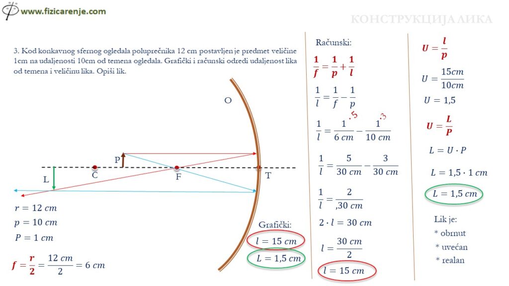 3. Kod konkavnog sfernog ogledala poluprečnika 12 cm postavljen je predmet veličine 1 cm na udaljenosti 10 cm od temena ogledala. Grafički i računski odredi udaljenost lika od temena i veličinu lika. Opiši lik.